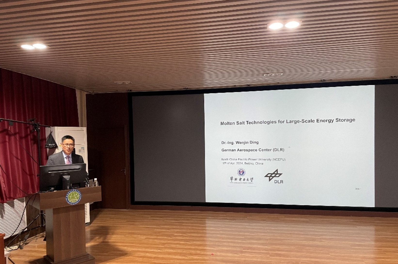聘任仪式结束后,丁文进教授作了题为“用于中长时大规模储能的熔盐储能技术研究进展与应用前景”的学术报告。报告中,丁博士就熔盐电池和熔盐储能技术展开了介绍,重点阐述了DLR在熔盐电池电解质开发及其腐蚀控制的研究成果,以及在新一代低成本高温氯化盐储热材料的突破性腐蚀控制技术,他介绍了中国旅德学者化学化工学会及其在促进海内外学者学术交流、人才培养等方面的丰富工作。中德英三方代表开展了国家合作项目的交流研讨,三方代表对推进熔盐卡诺电池储能技术领域的中德/中欧项目申请和技术推广达成了深入合作意向。