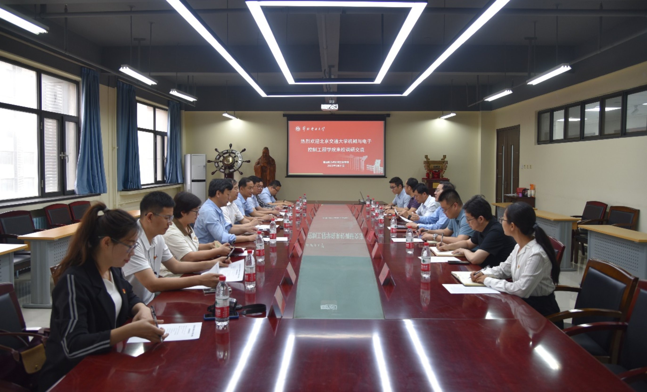 会上,双方在全国党建工作标杆院系的申报与建设、党建工作与事业发展融合、课程思政建设、基层组织建设、能动类专业建设与人才培养等方面进行了充分探讨。随后,北京交通大学机械与电子控制工程学院一行参观了热能与动力工程国家级实验教学示范中心和国家火力发电工程技术研究中心。