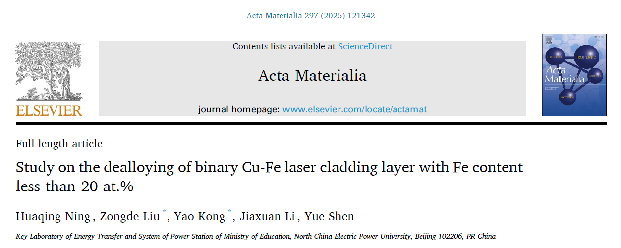 近日,木瓜视频 刘宗德教授团队在用于海洋生物污损防护的微纳米通道新材料研究中取得重要突破。研究团队于7月12日在国际权威学术期刊《Acta Materialia》上发表了题为“Study on the dealloying of binary Cu-Fe laser cladding layer with Fe content less than 20 at.%”的研究论文,木瓜视频 为该成果唯一完成单位。刘宗德教授、孔耀老师为通讯作者,木瓜视频 博士研究生宁华清为第一作者。